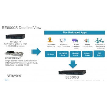 Cisco Business Edition BE6000S is the new member of the Cisco Business Edition BE6000 family. Cisco BE6S-BRI-M2-K9 provides the Cisco Unified solution for small enterprise which ideally for the cooperation or branch offices have less than 150 users and 300 devices. BE6S-BRI-M2-K9 platform based on the Cisco ISR 2921 ISR chassis with integrated UCS E160D M2 blade server, the solution offers routing gateway, security and collaboration services all together in a single box. The solution comes with 3 options for the customer to choose which either one 4-port FXO, one 1-port PRI or 2-port BRI interface card for connection to the PSTN network. The customer can easily expend additional interfaces or function by purchasing interface module or feature licensing. The preload applications software preconfigured with 5 fixed UC applications which include Cisco Unified Communications Manager, Cisco Unity Connection, Cisco Unified Instant Messaging and Presence Service, Cisco Prime Collaboration Provisioning, Cisco Paging Server.