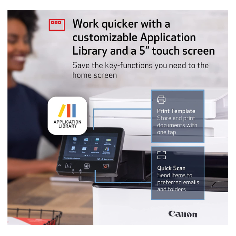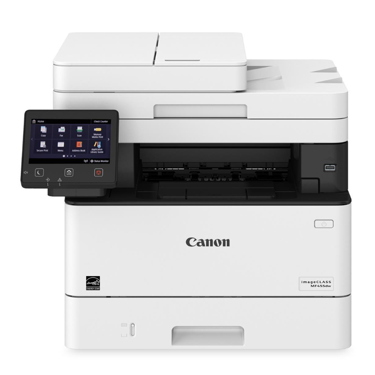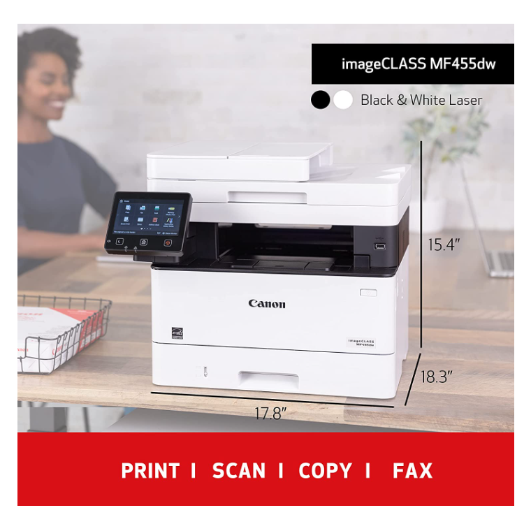 The imageCLASS MF455dw is designed for small and medium-size businesses and allows you to print, scan, copy, and fax in black and white. It balances speedy performance, minimal maintenance, and the ability to add an optional paper tray. A 5" color touchscreen delivers an intuitive user experience and can be customized by a device administrator to simplify many daily tasks. The printer comes with the Canon Genuine Toner 057 Black, which yields 3100 pages. The optional 057 High Capacity Black toner is also supported.