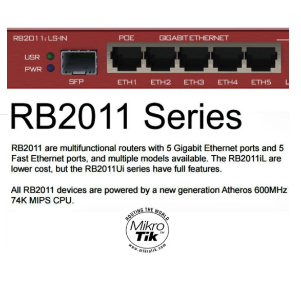 MikroTik 2011iLS-IN, RB2011iLS-IN, Gigabit Router SFP 5 port PoE OSL4 FTTHMikroTik RB2011iLS is our first product with SFP cage for gigabit SFP transceivers and ideal solution for FTTH (Fiber To The Home) implementations. The RB2011iLS has 11 ports: Gigabit SFP cage and five Gigabit Ethernet ports that can be switched together providing affordable wirespeed Fiber-to-Copper converter, and additional five Fast Ethernet ports. Board can be powered by power jack or PoE.