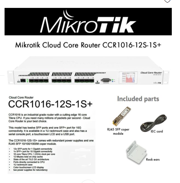 MIKROTIK CCR1016-12S-1S+ Cloud Core Router 12x SFP, 1x SFP+ 10Gbit RouterOS L6Mikrotik Cloud Core Router CCR1016-12S-1S+ is an industrial grade router with a cutting edge 16 core Tilera CPU. If you need many millions of packets per second - Cloud Core Router is your best choice. This model has twelve SFP ports and one SFP+ port for 10G connectivity. It is available in a 1U rackmount case and also has a serial console port, a touchscreen LCD and a USB port.