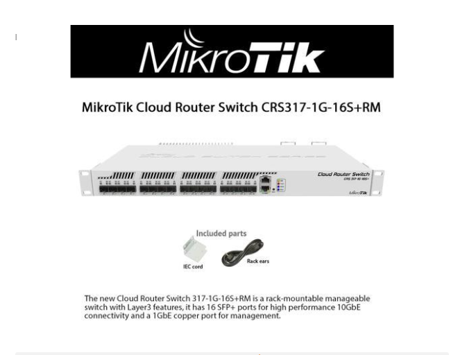 Product Includes: * (1) CRS317-1G-16S+RM * (2) IEC Cord * (2) Rackmount Ears