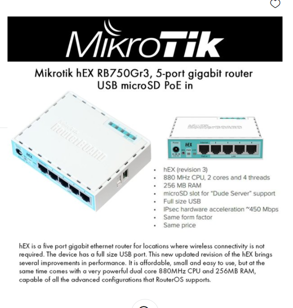 hEX is a five port gigabit ethernet router for locations where wireless connectivity is not required. The device has a full size USB port. This new updated revision of the hEX brings several improvements in performance.hEX is a five port gigabit ethernet router for locations where wireless connectivity is not required. The device has a full size USB port. This new updated revision of the hEX brings several improvements in performance. It is affordable, small and easy to use, but at the same time comes with a very powerful dual core 880MHz CPU and 256MB RAM, capable of all the advanced configurations that RouterOS supports.