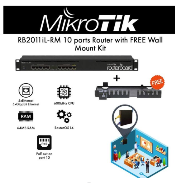 Mikrotik RB2011iL-RM Multifunctional Router 5xEthernet, 5xGigabit Ethernet, PoE Out on Port 10 with Free RB2011 Wall Mount Kit
