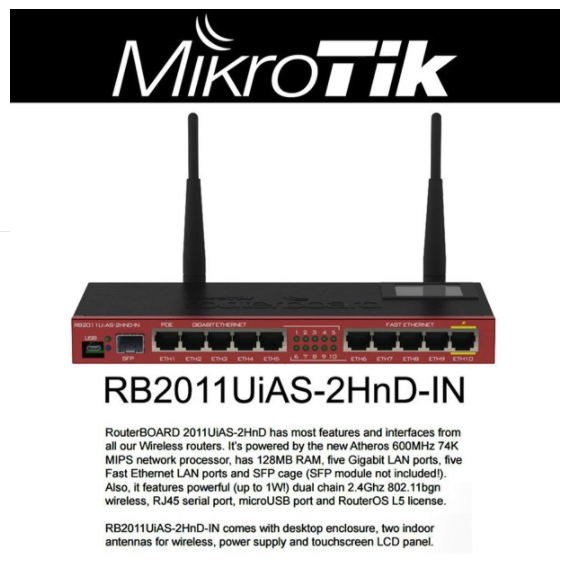 Mikrotik RB2011Ui RouterBOARD RB2011UiAS-2HnD-IN Wireless Router 5 Gigabit LANMikrotik RouterBOARD RB2011UiAS-2HnD-IN, 600MHz 74K MIPS network processor, 128MB RAM, 5 Gigabit LAN ports, 5 Fast Ethernet LAN ports and SFP cage. 1000mW dual chain 2.4Ghz 802.11bgn wireless AP, OSL5 license.