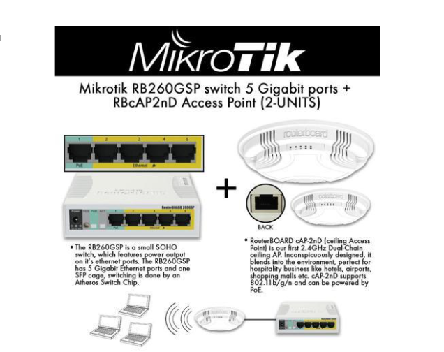 The RB260GSP is a small SOHO switch, which features power output on its ethernet ports. Ports 2-5 can power other PoE capable devices with the same voltage as applied to the unit (passive PoE over datalines only). The RB260GSP has five Gigabit Ethernet ports and one SFP cage, switching is done by an Atheros Switch Chip. The device is running an operating system designed specifically for MikroTik Switch products - SwOS. RouterBOARD cAP-2nD (ceiling Access Point) is our first 2.4GH z Dual-Chain ceiling AP. Inconspicuously designed, it blends into the environment, perfect for hospitality business like hotels, airports, shopping malls etc.