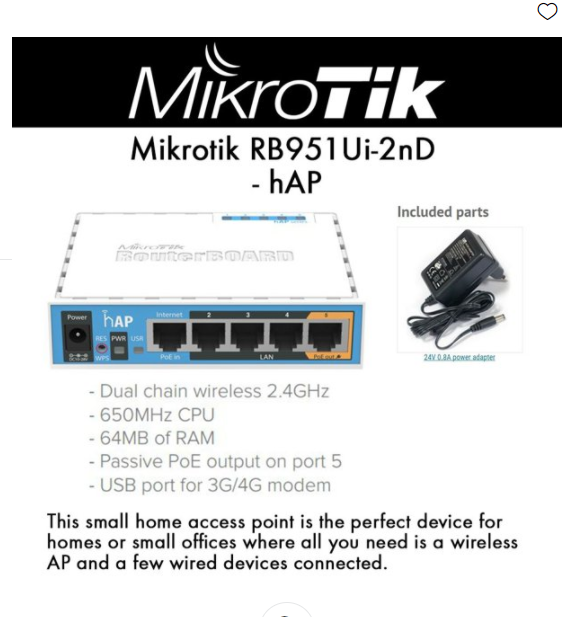 MikroTik RB951Ui-2nD hAP Indoor Wireless Router, 802.11b/g/n, 64MB RAM, 650MHzThe MikroTik RB951Ui-2nD home wireless AP you have been waiting for! It has five Ethernet ports and a 802.11b/g/n wireless AP with an antenna built in.This small home access point is the perfect device for homes or small offices where all you need is a wireless AP and a few wired devices connected. Based on the popular RB951-2n, the new hAP is an improvement in many areas.