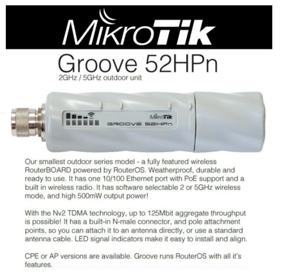 Mikrotik RouterBOARD Groove 52HPn, RBGroove-52HPn Outdoor CPE/AP OSL3Mikrotik RouterBOARD Groove-52HPn RBGroove-52HPn with 600MHz Atheros CPU, 64MB RAM, 1 LAN, 1 built-in 2.4/5GHz 802.11a/b/g/n wireless interface, RouterOS L3, mounting loops, PoE injector, 24V power adapter.